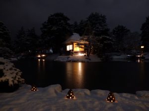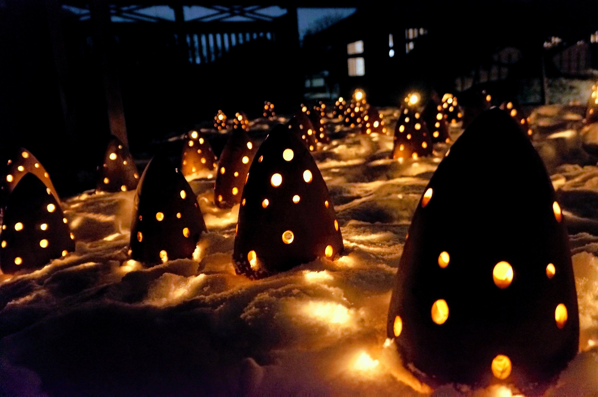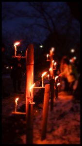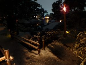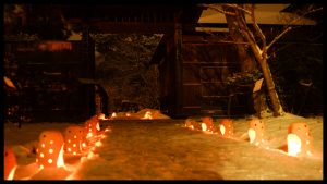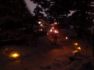 2日目は雪が積もり、凛とした夜の帳の静寂に包まれた園内は、蝋燭の炎が揺れ動き、仄かで暖かな灯が幽玄夢幻の雰囲気を漂わせていました。
