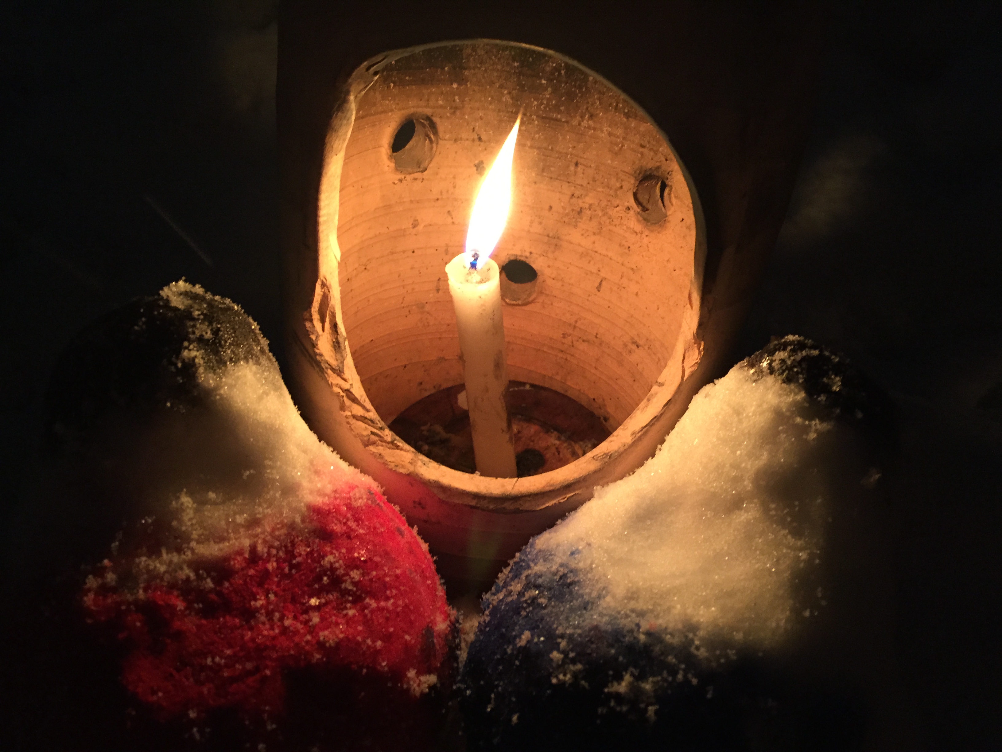 起き上がり小法師達が厳しい寒さの中で絵ろうそくの温もりを感じています。