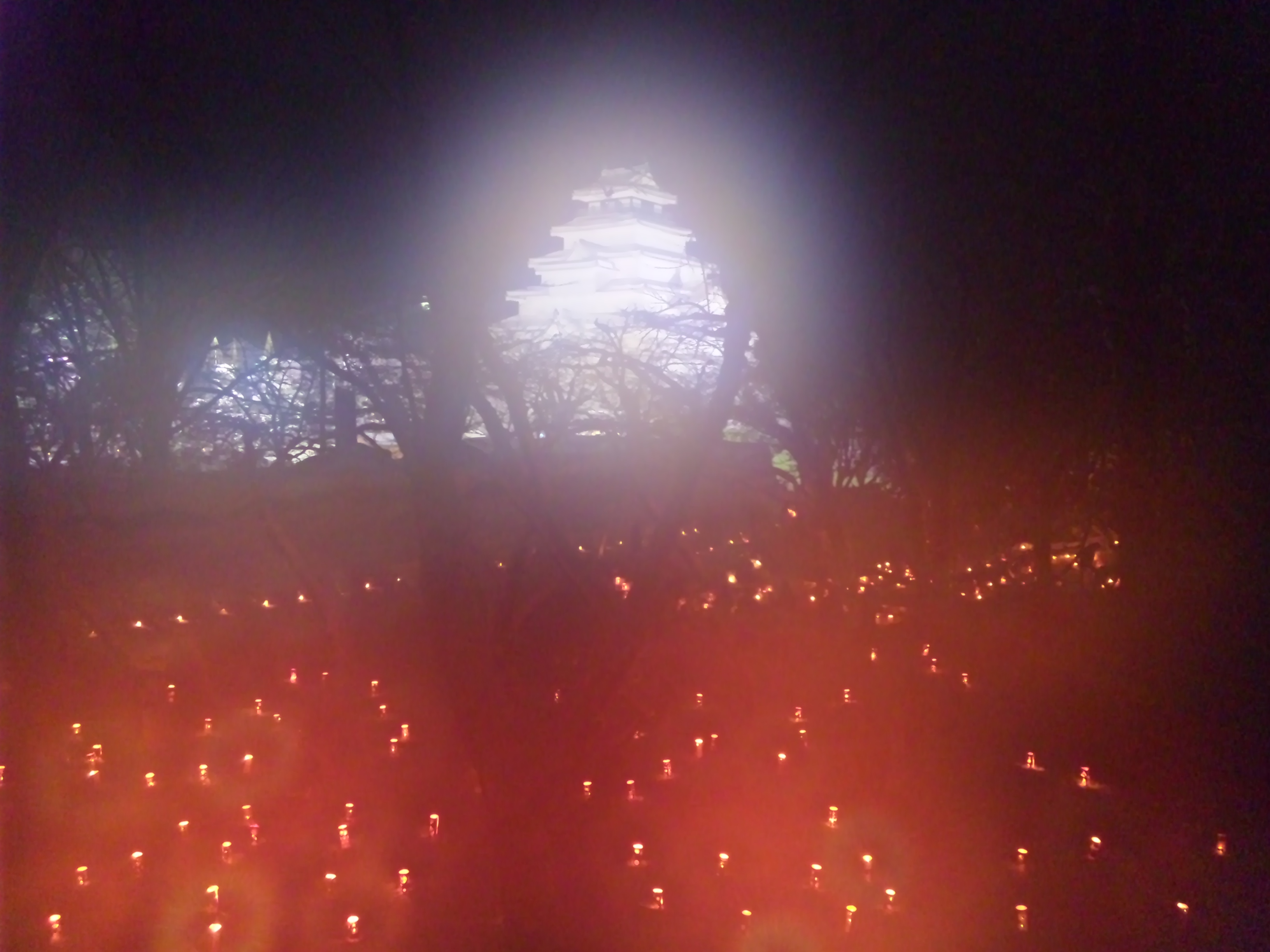 □雪面に揺れる雪ほたるの炎と、夜空に映える天守閣。