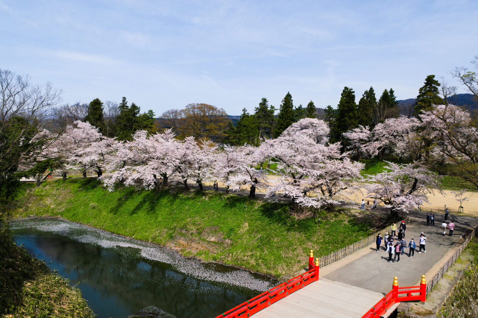The Sakura trees are in full bloom, their branches heavy with delicate pink blossoms. As a gentle breeze rustles through the air, the petals begin to fall, creating a soft, ethereal rain of pink that dances gracefully to the ground. The temperature is a pleasant 18°C, enhancing the serene beauty of the scene..