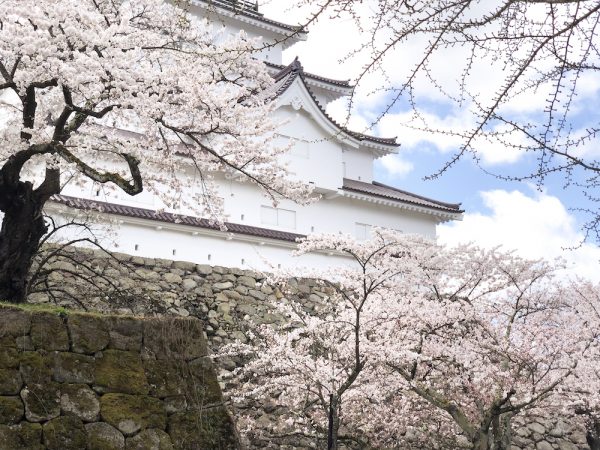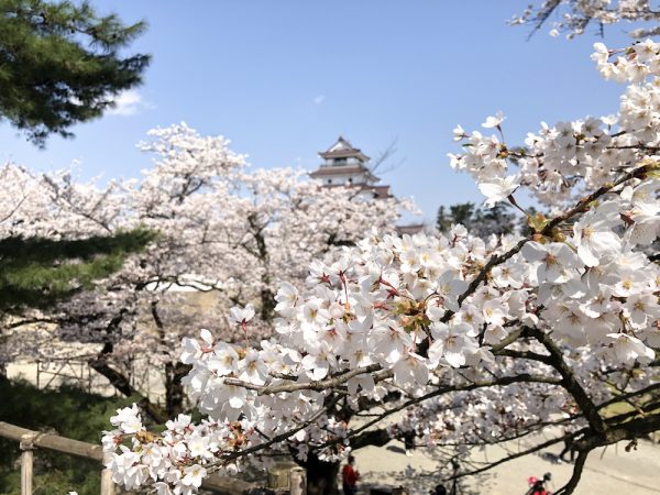 青空の下、鶴ヶ城内の桜は満開です。
