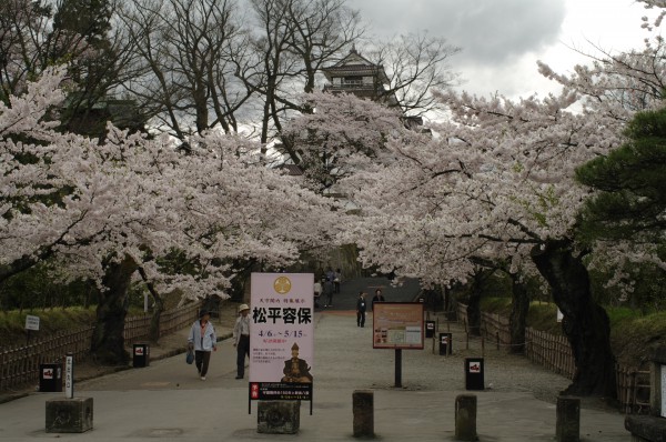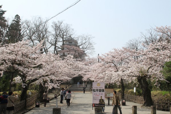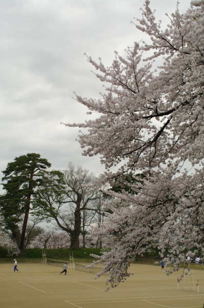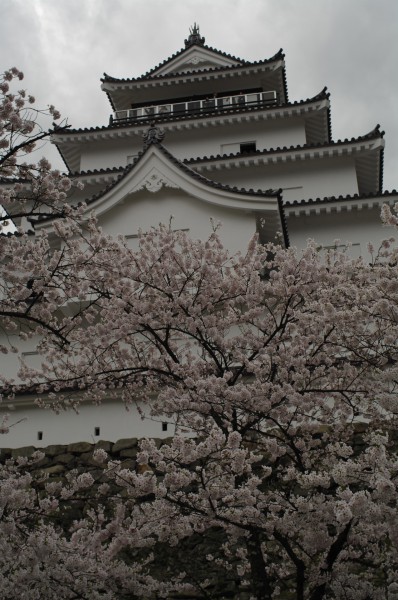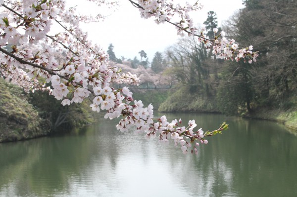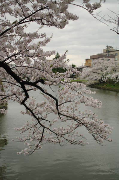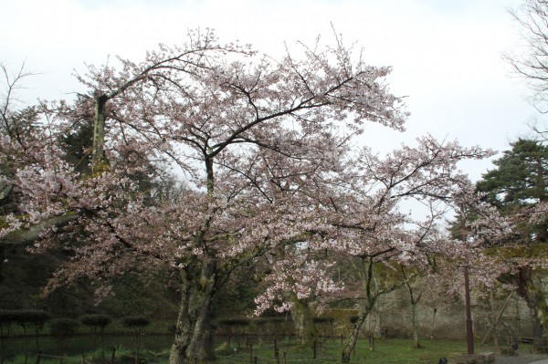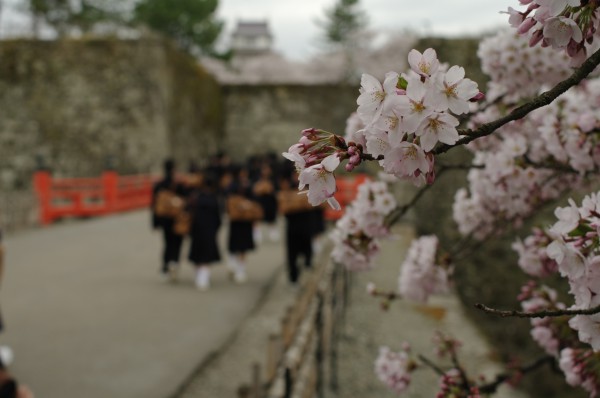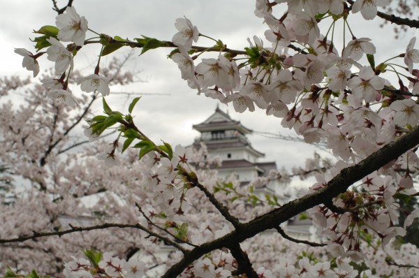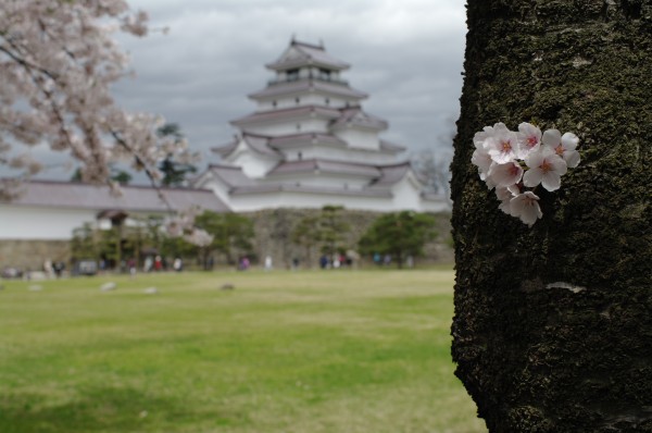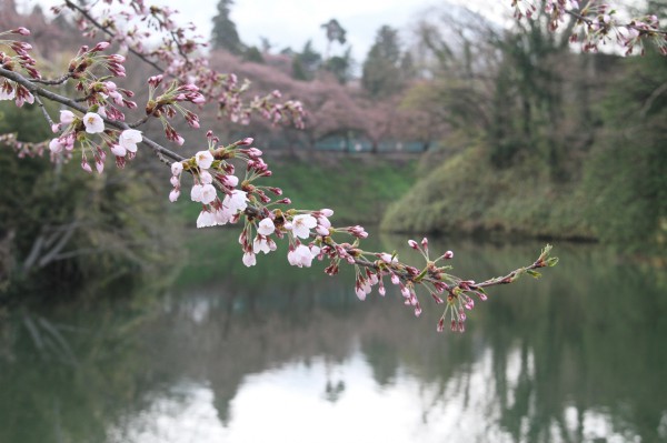 桜のつぼみも雨に負けること無く、着々と開花しています。鶴ヶ城全体の開花としては7, 8分咲きといったところですが、場所によっては8, 9分咲きの木が見受けられます。