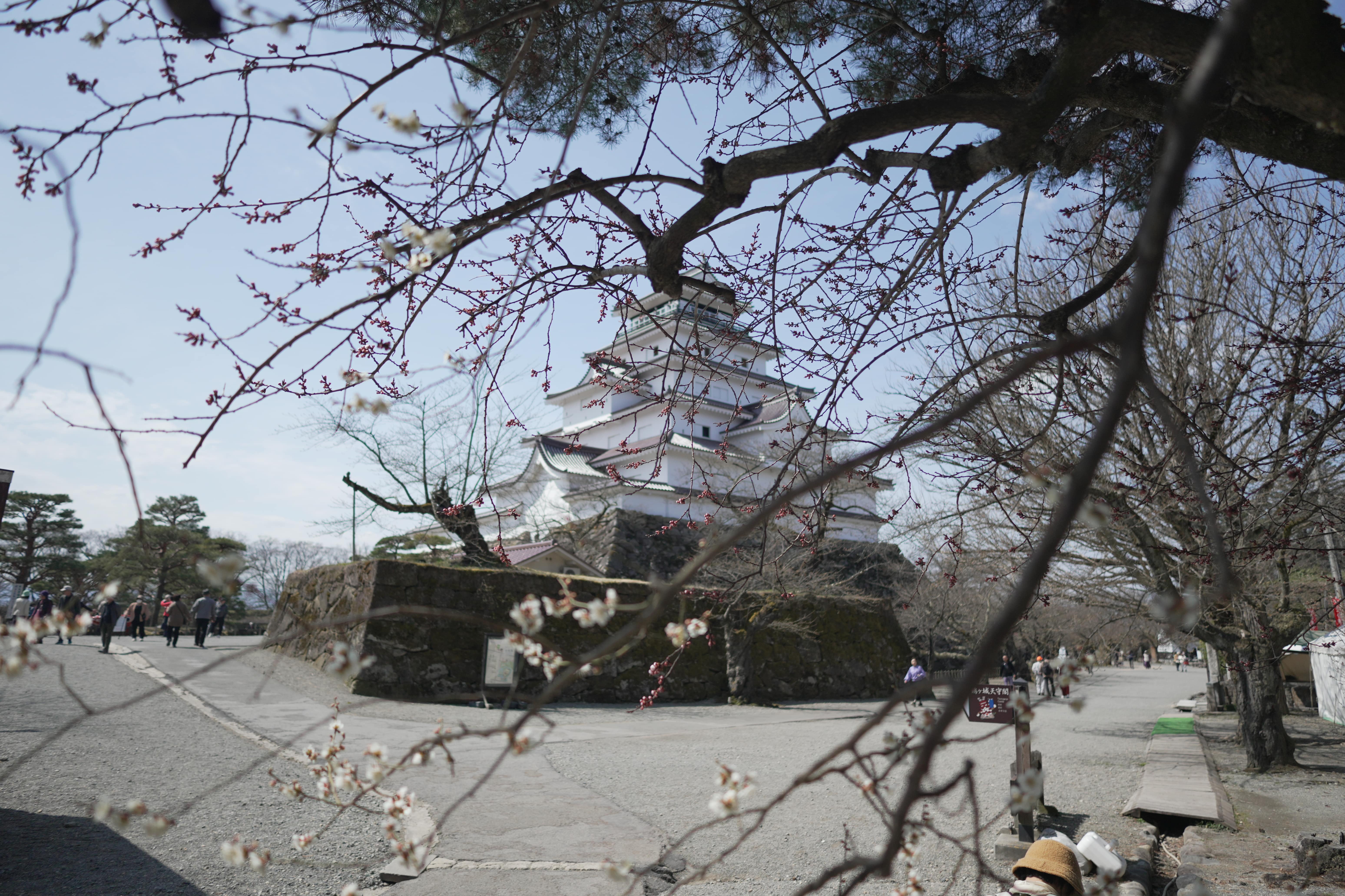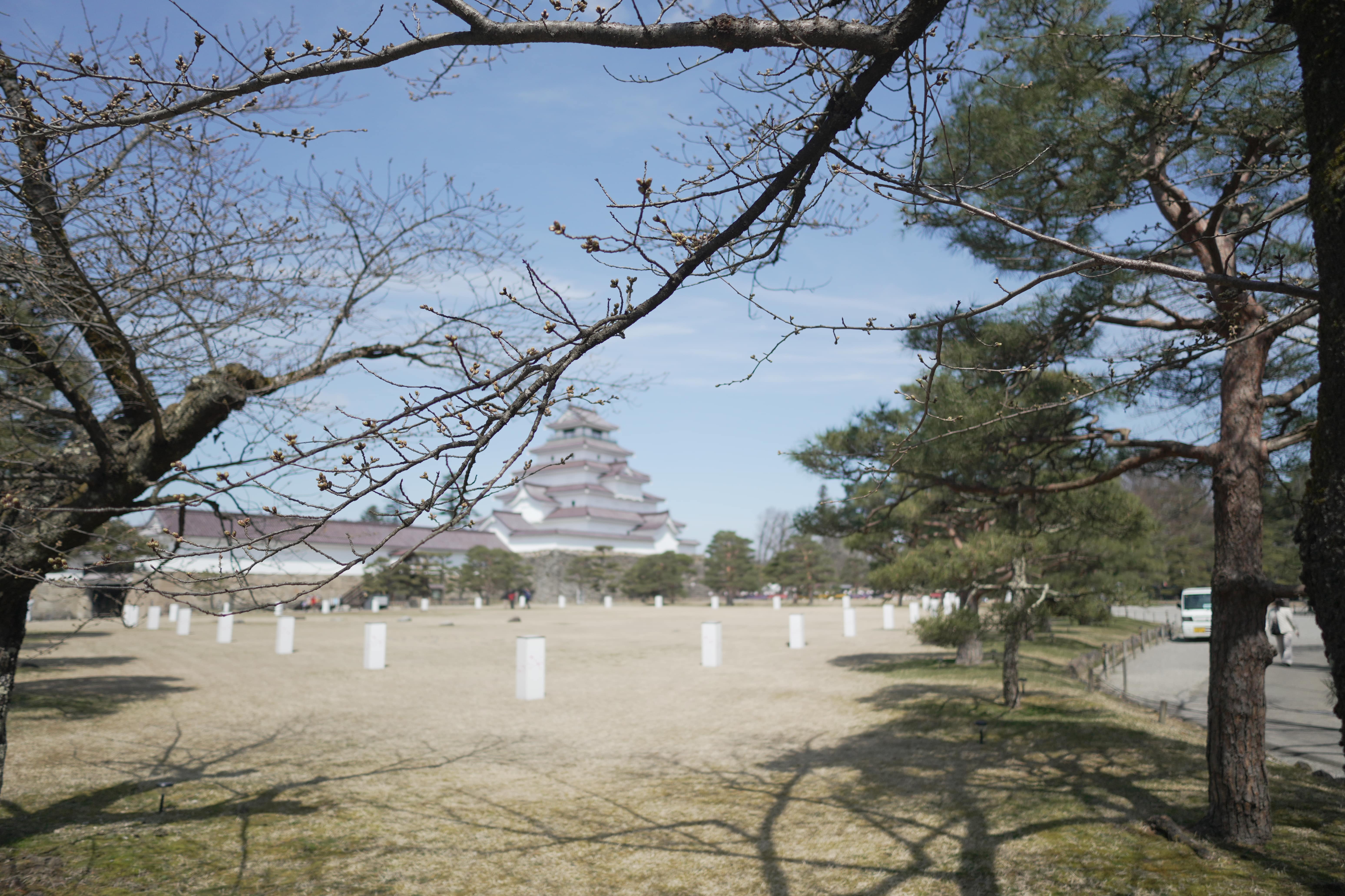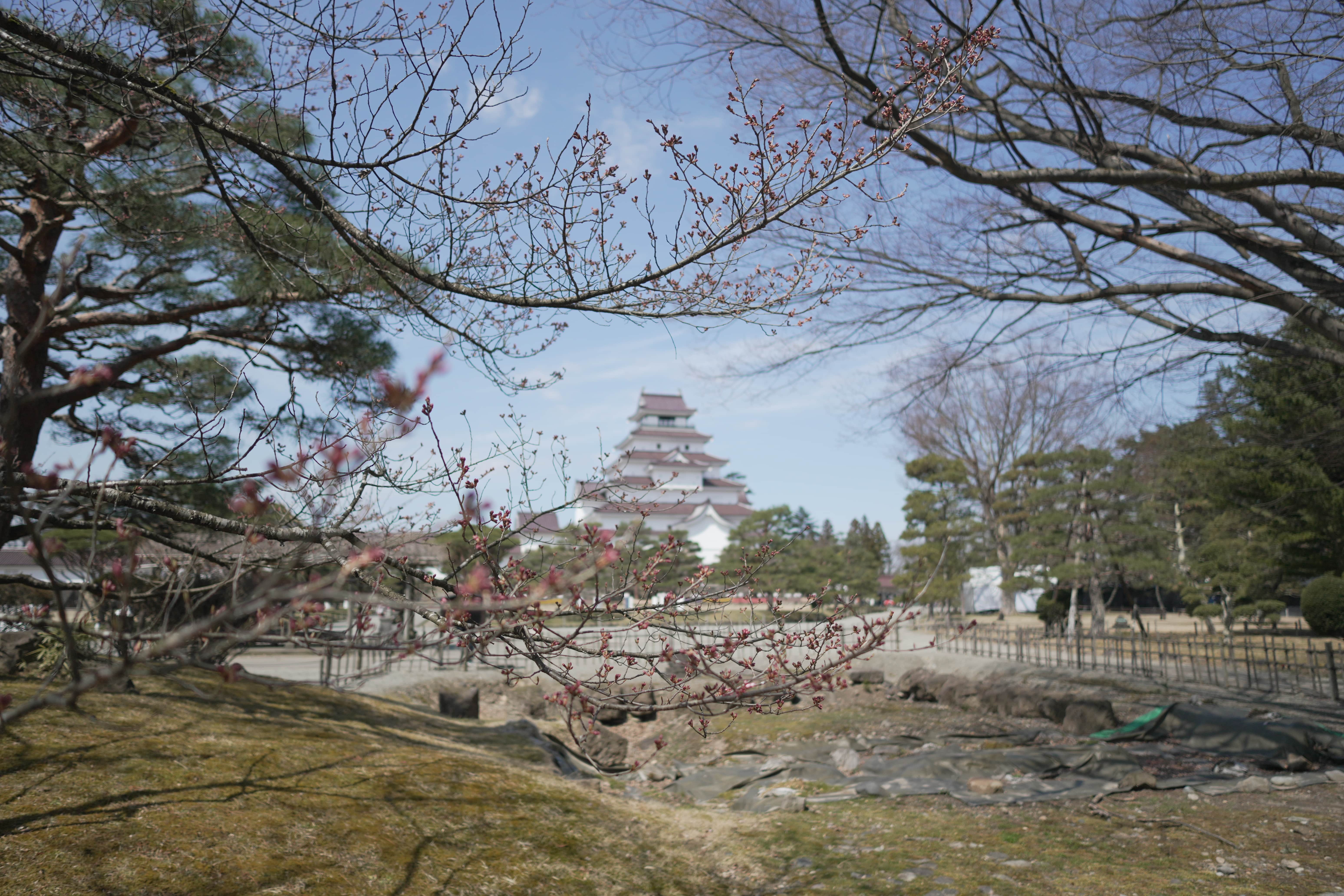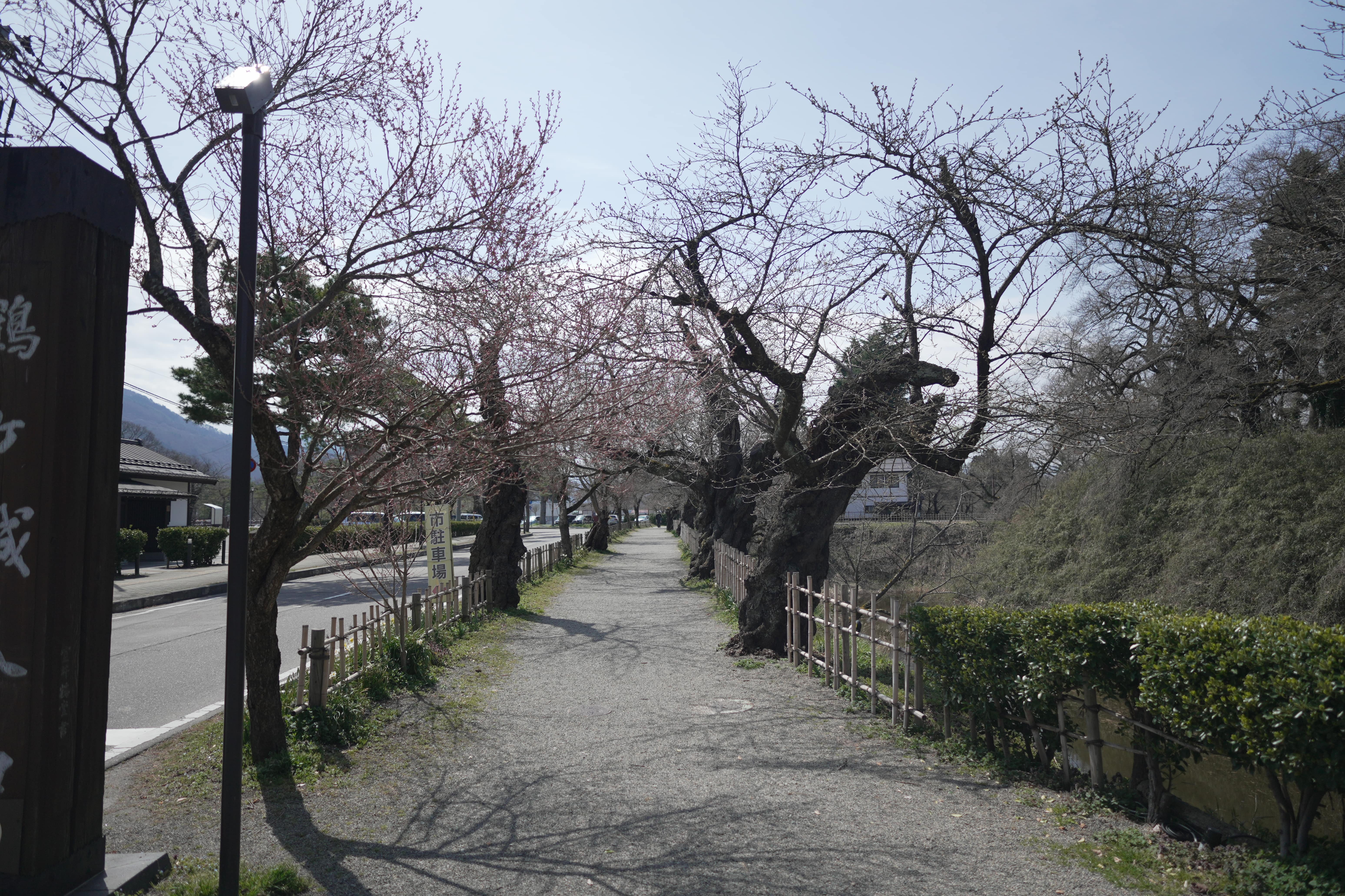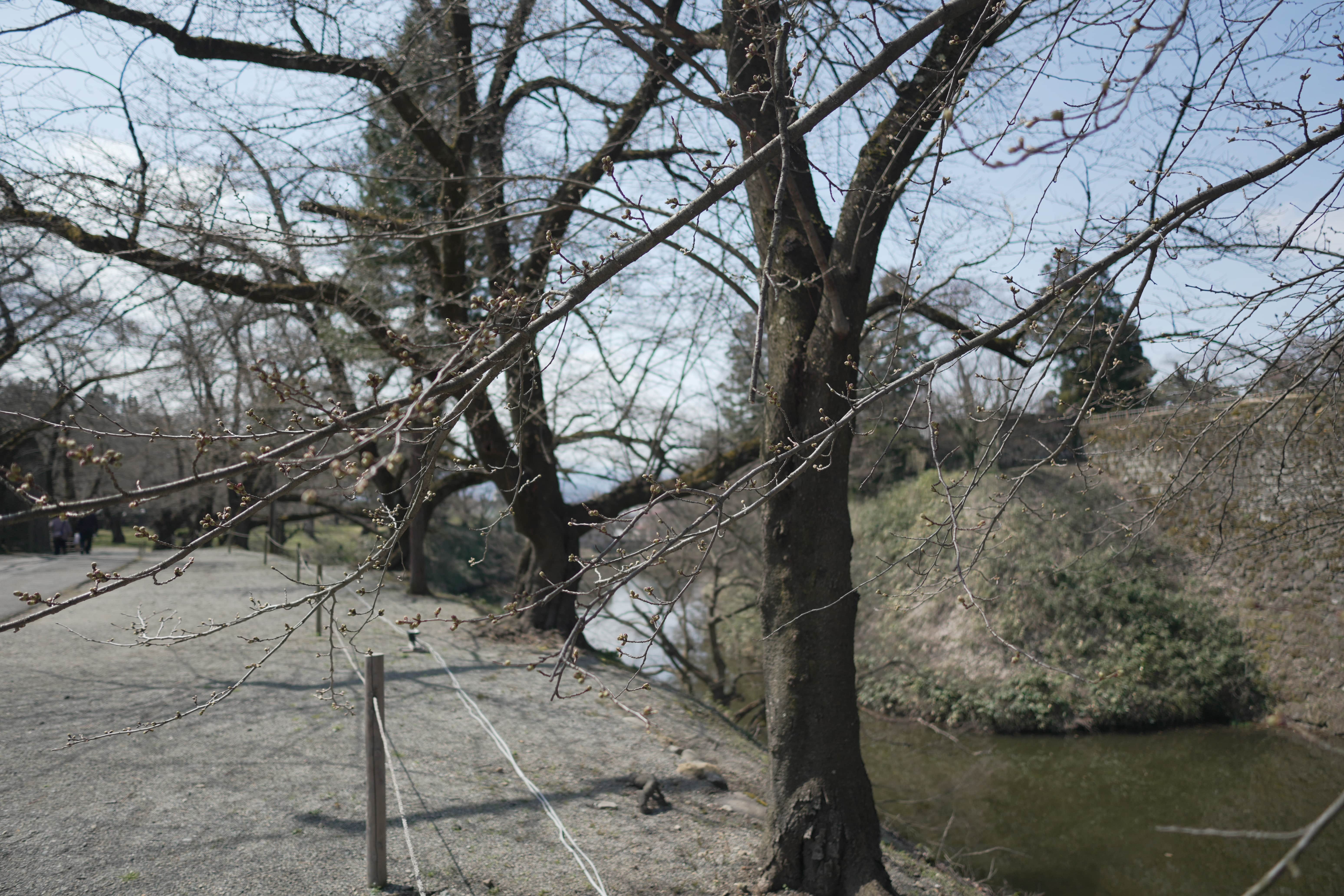 On this sunny day at 12°C, almost every Cherry blossom at Aizu castle is blooming.
