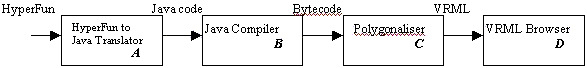 The translator started life as an undergraduate assignment for a course teaching parsing techniques at the University of Warwick. The students were asked to write a lexical analyzer and parser generator [2] for the HyperFun notation. The final part of the assignment asked the students to add semantic actions to their parser that write out Java code corresponding to a HyperFun model presented as input. To support the students work, they were provided with the standard HyperFun library of shapes hand translated into Java and a simple polygonalisation algorithm (similar to Bloomenthals tetrahedral decomposition [6]) for the realization of HyperFun models as VRML files [26]. Successful students and the author of the model solution could then take a HyperFun model (see Fig. 6), translate it into new Java code (A), compile this Java code using the standard Java compiler (B), and execute this code to generate a VRML realisation of the HyperFun model (C). The shape can be viewed and explored in a VRML browser (D) such as CosmoPlayer from Cosmo Software (see http://cosmosoftware.com/).