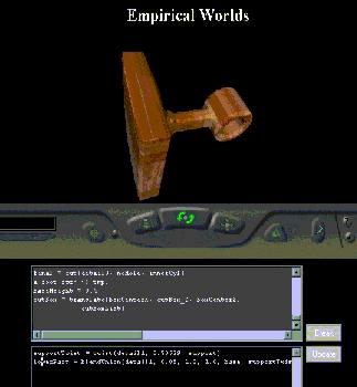 The Empirical Worlds proof-of-concept application [11] demonstrates how an algebra of shape, including a large family of primitive shape types and operators on those primitives defined using F-rep techniques, can be used as the underlying algebra of a definitive notation [3]. A screenshot of Empirical Worlds in use is given in Fig. 7. In Empirical Worlds, it is possible to create an instance of a shape type and assign it a name. Defining parameters used to create a specific instance of a shape data type are given to the application using syntax similar to that of VRML. As an example, the following two lines of scripts (each assignment is known as a definition) create an instance of a solid box and a solid cylinder shape: