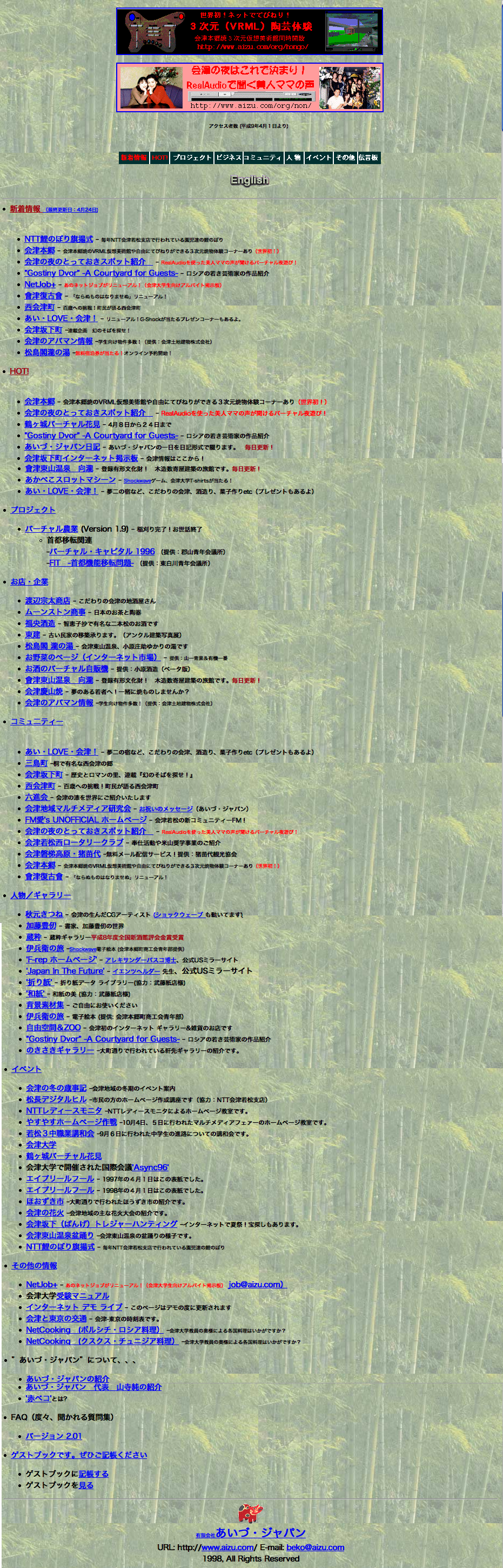 今日の表紙は、10年前のaizu.comの表紙です。世の中もweb1.0からweb2.0へ進化してますが、Eyes, JAPANも初心を忘れる事無く、これからも成長したいと思っておりますので、今後ともよろしくご指導、ご鞭撻のほどをお願いいたします。 (これはエイプリール・フールではありません) 2008年4月1日 Eyes, JAPAN 山寺 |
