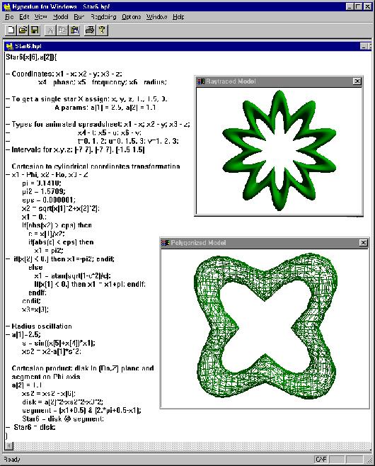 Application software provides visual representation (ray-tracing, non-photorealistic rendering), animation, conversion to other representations (polygonization, VRML generation, voxelization), analysis, storage, rapid prototyping, and other types of processing of HyperFun models. An application reads the model and invokes the interpreter to parse it and to evaluate the function at a set of points. Although the detailed description of applications is beyond the scope of this paper, let us discuss one example, that of using ray-tracing to visualize a multidimensional model.