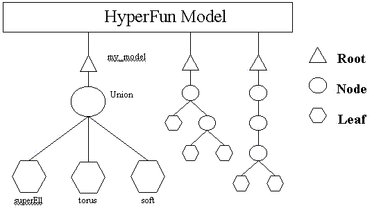 A model in HyperFun can contain the specification of several geometric objects. Each object is defined by a function parametrized by input arrays of point coordinates and free numerical parameters. The number of coordinate variables can be greater than three to allow definition of higher dimensional objects. The function can be quite complex: it is represented with the help of assignment statements (using auxiliary local variables and arrays, if necessary); conditional selection ('if-then-else'), and iterative ('while-loop'). Functional expressions are built using conventional arithmetic and relational operators. It is possible to use standard mathematical functions ('exp', 'log', 'sqrt', 'sin', etc.). Fundamental set-theoretic operations are supported by special built-in operators with reserved symbols ("|" - union, "&" - intersection, "\" - subtraction, "~" - negation, "@" - Cartesian product).