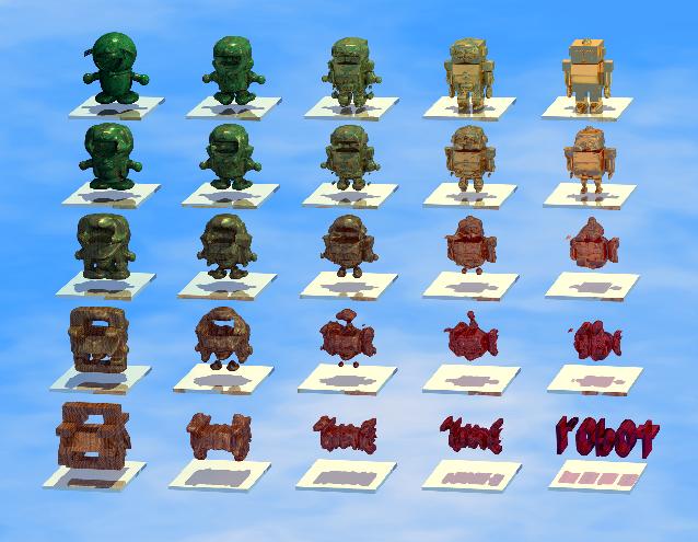 In Fig. 9 we present a ray-traced image illustrating a bi-directional metamorphosis, which is a non-traditional operation in computer graphics and animation. It results in a smooth transformation (metamorphosis) between four key 3D shapes modeled using F-rep. Algebraically, the model of the bi-directional metamorphosis is the bilinear interpolation between four real-valued functions by coordinates x4 and x5. Geometrically, it is a 5D object defined by the real function as